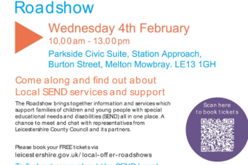 04 Feb Leicestershire SEND Local Offer Roadshow, Melton Mowbray Parkside Civic Suite (Community events) 4 February 2026 Find out more