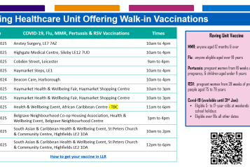 Roving Healthcare Units are used for NHS walk -in services across the region. Please see the updated schedule for the roving healthcare unit, offering walk-in COVID, flu, RSV, pertussis and MMR vaccinations to anyone who is eligible.