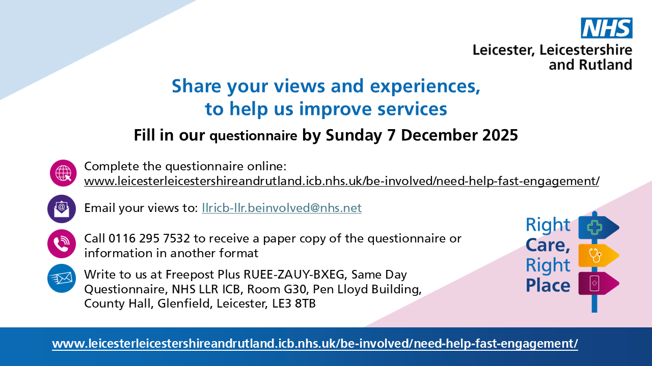 Leicester City patients only are also invited to share their views about a new same-day appointment offer, commencing 1 October 2025.