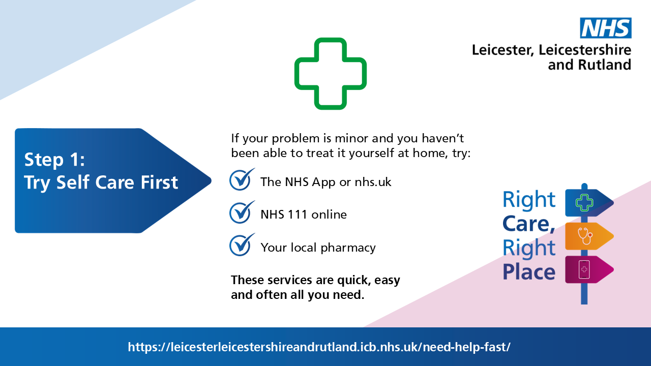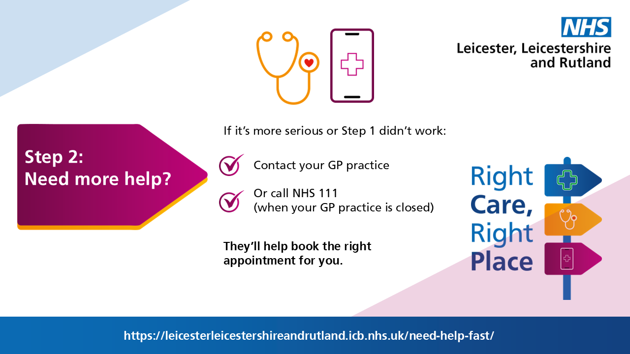 The NHS in Leicester, Leicestershire and Rutland would like to hear your views about a new two-step process for getting help when you need it quickly, as well as your views and experiences of GP practice and pharmacy services.