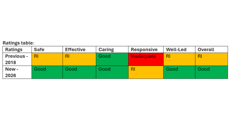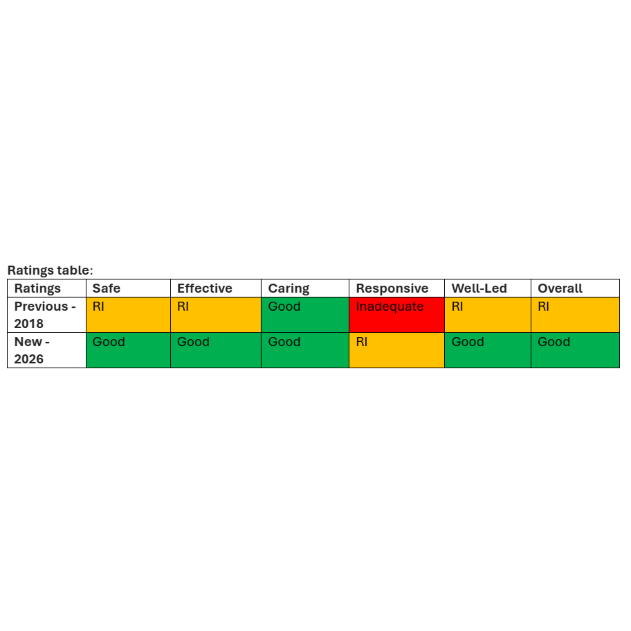The services were last inspected in November and December 2018 and rated then as ‘Requires Improvement’. The CQC’s new report, published on 10 April, has improved the rating for the service as ‘Good’ overall, with ‘Good’ in the domains of safe, well-led, effective and caring - and ‘Requires Improvement’ for the responsive domain.